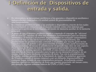El documento describe los diferentes tipos de periféricos de una computadora. Menciona que los periféricos son dispositivos auxiliares conectados a la CPU que permiten la entrada y salida de datos, como también el almacenamiento y comunicación. Describe los periféricos más comunes de entrada (teclado, mouse, escáner), salida (monitor, impresora, parlantes) y almacenamiento (disco duro, unidad de CD/DVD).