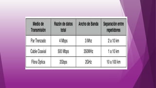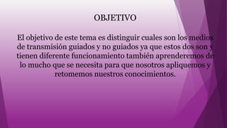 Este documento explica los diferentes tipos de medios de transmisión, incluyendo medios guiados como el par trenzado, cable coaxial y fibra óptica, y medios no guiados como transmisiones direccionales y omnidireccionales. Los medios guiados utilizan un cable para conducir las señales de un extremo a otro, mientras que los medios no guiados transmiten señales de forma dispersa mediante ondas electromagnéticas. El documento enfatiza la importancia de distinguir entre estos tipos de medios de transmisión y aplic