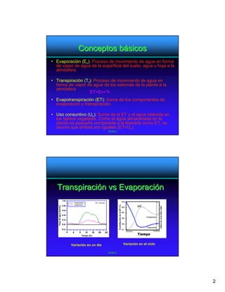 El documento detalla conceptos y estimaciones de la evapotranspiración (ET) en cultivos, considerando factores como clima, tipo de cultivo y condiciones del suelo. Se abordan métodos para calcular la evapotranspiración real y potencial, así como los requerimientos de riego simplificados y la importancia de ajustar las estimaciones según la humedad del suelo. Además, se describen ecuaciones y procedimientos para medir y calcular la evapotranspiración de referencia, así como la eficiencia de diferentes sistemas de riego.