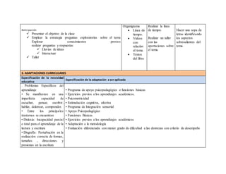 Este documento presenta un plan de estudios sociales para cuarto grado con el objetivo de procurar un conocimiento racional y crítico del pasado de la humanidad. Incluye una unidad sobre la formación de la humanidad con estrategias como líneas de tiempo y videos. También detalla adaptaciones curriculares para apoyar a estudiantes con necesidades específicas como dislexia o disgrafía.