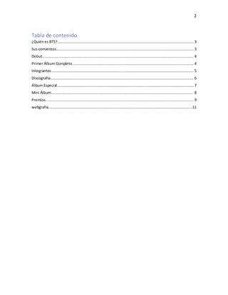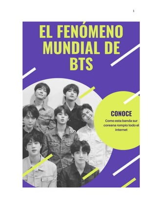 BTS es un grupo de K-pop que debutó en 2013 y se ha convertido en un fenómeno mundial. El grupo está compuesto por 7 integrantes: RM, Jin, Suga, J-Hope, Jimin, V y Jungkook. Han lanzado varios álbumes de estudio como Dark & Wild, Wings y Map of the Soul: 7. BTS ha ganado cientos de premios y ha roto récords, convirtiéndose en el primer artista coreano en presentarse en los Grammy y en encabezar listas de éxitos internacionales.