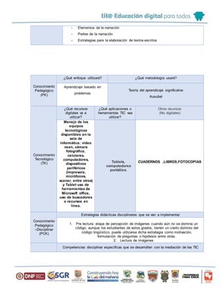 Este documento presenta una matriz TPACK (Technological Pedagogical Content Knowledge) para el diseño de actividades de un proyecto educativo sobre la producción de textos orales y escritos. La matriz describe el conocimiento disciplinar, pedagógico, tecnológico, pedagógico-disciplinar y pedagógico-tecnológico-disciplinar necesario, así como las estrategias, actividades, competencias del siglo XXI, oportunidades de aprendizaje diferenciado y procesos de evaluación que se implementarán. Las actividades prop