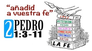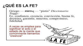 El documento describe la fe como la virtud que nos permite recibir las promesas de Dios y participar de su naturaleza divina. Explica que la fe viene por la Palabra de Dios y reside en el corazón del hombre. También menciona varios ejemplos bíblicos como Abel, Enoc, Abraham y otros que por su fe agradaron a Dios y realizaron grandes hazañas. Concluye que la fe es la garantía de lo que esperamos aunque no lo veamos y nos permite heredar promesas de Dios.