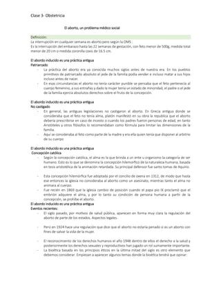 El documento describe la historia y situación actual del aborto. Históricamente, el aborto era una práctica antigua que no se castigaba en las antiguas civilizaciones. La Iglesia Católica lo prohibió en el siglo XIX al considerar que el feto tiene alma desde la concepción. Actualmente, la mayoría de abortos son inseguros y ocurren en países en desarrollo, poniendo en riesgo la vida de las mujeres. Reducir los embarazos no deseados a través de la anticoncepción es clave para dis
