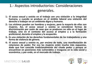 Este documento describe el acoso sexual y sexista en ambientes laborales. Explica que es una violación de los derechos humanos y una forma de discriminación que afecta principalmente a las mujeres. Define los tipos de acoso sexual (vertical u horizontal) y sus efectos negativos en la salud física y mental de las víctimas, así como en su desempeño laboral y vida familiar. Finalmente, resume los pasos a seguir para denunciar casos de acoso sexual.