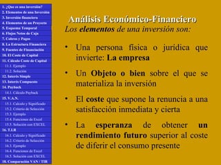 Este documento describe los conceptos básicos de una inversión financiera. Los elementos clave de una inversión incluyen la persona u organización que invierte, el objeto de la inversión, el costo de renunciar al consumo actual y la esperanza de obtener un rendimiento futuro mayor. Una inversión financiera implica la inmovilización de recursos financieros con la esperanza de que los ingresos futuros superen dicha inmovilización. El análisis económico-financiero de un proyecto de inversión evalúa los flu