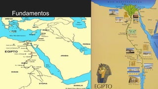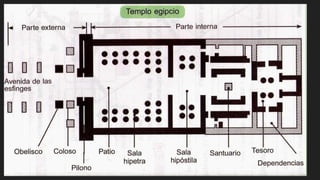 El documento resume la cronología del Antiguo Egipto, desde el Imperio Antiguo hasta el Período Tardío, y describe aspectos de la arquitectura, escultura y pintura egipcias, incluyendo tumbas, templos, columnas, relieves, estatuas y técnicas pictóricas. Se destacan monumentos como las pirámides de Zoser, Seneferu y Keops, el Valle de los Reyes, y obras como la estatua de Nefertiti y el relieve de Akhenaton y Nefertiti.