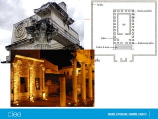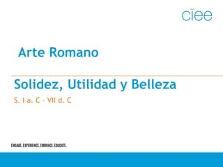 El documento resume las principales características del arte romano entre los siglos I a.C. y VII d.C. La arquitectura romana era funcional y práctica, tomando influencias de los etruscos y los griegos. Los romanos destacaron en la construcción de edificios públicos como templos, teatros, anfiteatros, acueductos y calzadas. También desarrollaron innovaciones como el uso del arco, la bóveda y el hormigón.