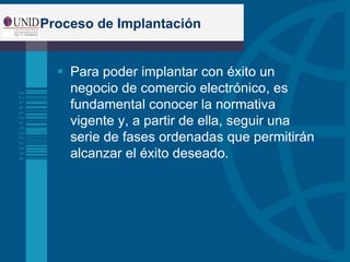 Este documento resume los aspectos regulatorios del comercio electrónico en México de acuerdo con la Ley de Servicios de la Sociedad de la Información. La ley crea un marco jurídico para generar confianza en el comercio electrónico e incluye la contratación de bienes y servicios en Internet. Los contratos electrónicos tienen la misma validez que los contratos en papel. La ley también establece requisitos de registro para empresas que realizan actividades económicas en Internet y obliga a mostrar información de contacto en los sitios web.