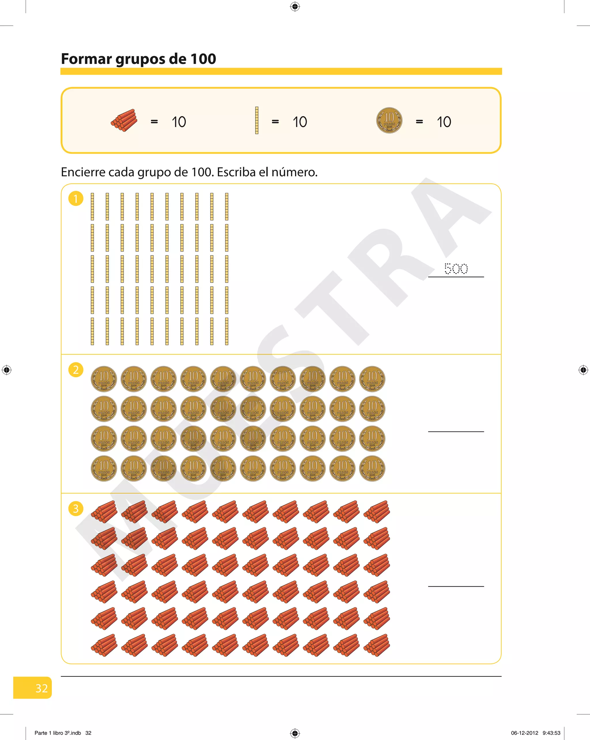 El documento presenta información sobre números hasta 1.000, incluyendo formar grupos de 100, contar de 100 en 100 y de otras formas, escribir y representar números, comprender el valor posicional, hacer equivalencias entre centenas, decenas y unidades, leer y escribir números, hacer equivalencias con dinero y calcular con dinero. El documento proporciona instrucciones y ejercicios para practicar estas habilidades numéricas fundamentales.