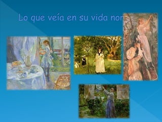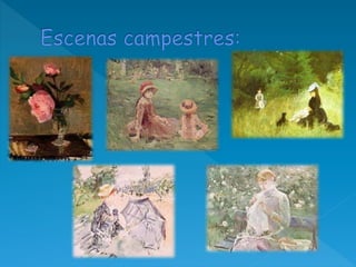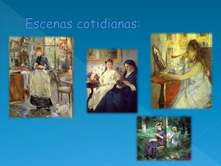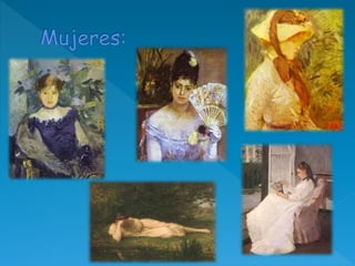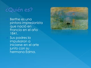 Berthe Morisot fue una pintora impresionista francesa nacida en 1841 que fue influenciada por artistas como Corot y Manet. Sus padres la impulsaron a dedicarse al arte junto a su hermana. Morisot destacó por utilizar grandes pinceladas y trabajar con óleo y acuarela, retratando escenas cotidianas y mujeres en obras como El balcón y Las majas en el balcón.