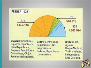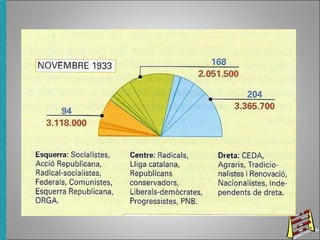El documento resume el periodo conocido como el Bienio Conservador (1933-1936) en la Segunda República Española. Tras unas elecciones en 1933, se forma un gobierno de coalición entre el Partido Radical y la CEDA que implementa políticas más conservadoras, lo que lleva a tensiones sociales y la Revolución de Octubre de 1934 en Asturias, duramente reprimida. Esto debilita al gobierno. En 1936, las elecciones son ganadas por el Frente Popular de izquierdas, formándose un nuevo gobierno pero con tension