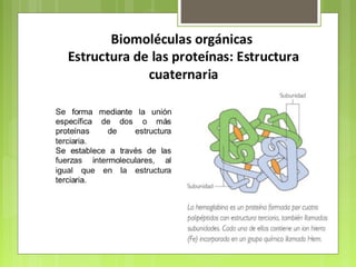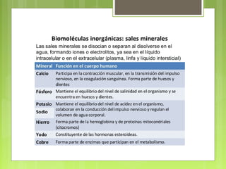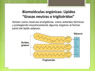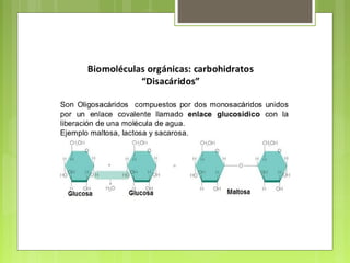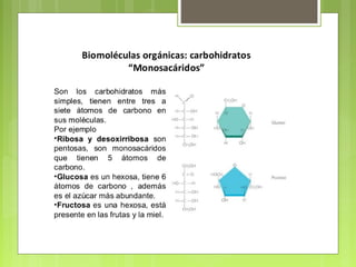 Este documento clasifica y describe las principales biomoléculas: carbohidratos, proteínas, ácidos nucleicos y lípidos. Explica su composición química, estructura y funciones clave. También incluye ejemplos importantes de cada tipo de biomolécula y un glosario de términos relacionados.