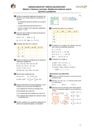 El documento presenta una serie de ejercicios y problemas relacionados con números racionales y medidas de tendencia central para el Módulo 1 de la Unidad Educativa "Amelia Gallegos Díaz".