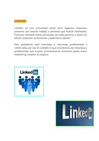 LinkedIn es una red social profesional donde los usuarios crean perfiles para mostrar su experiencia laboral y educación. Fue fundada en 2002 por Reid Hoffman y actualmente tiene más de 350 millones de usuarios en todo el mundo. LinkedIn permite a las personas y empresas conectarse profesionalmente, buscar empleo u oportunidades de negocio, y ampliar sus redes de contactos.