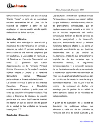 Este documento evalúa la calidad de los servicios farmacéuticos comunitarios en el área de salud "Camilo Torres" en Santiago de Cuba. Los resultados mostraron que los servicios no tenían calidad debido a la falta de profesionales farmacéuticos, equipamiento deficiente y cumplimiento inadecuado de funciones relacionadas al uso racional de medicamentos, lo que causó insatisfacción entre pacientes, médicos y farmacéuticos. Se propuso un plan de acción basado en fortalecer las áreas positivas para mejorar la calidad