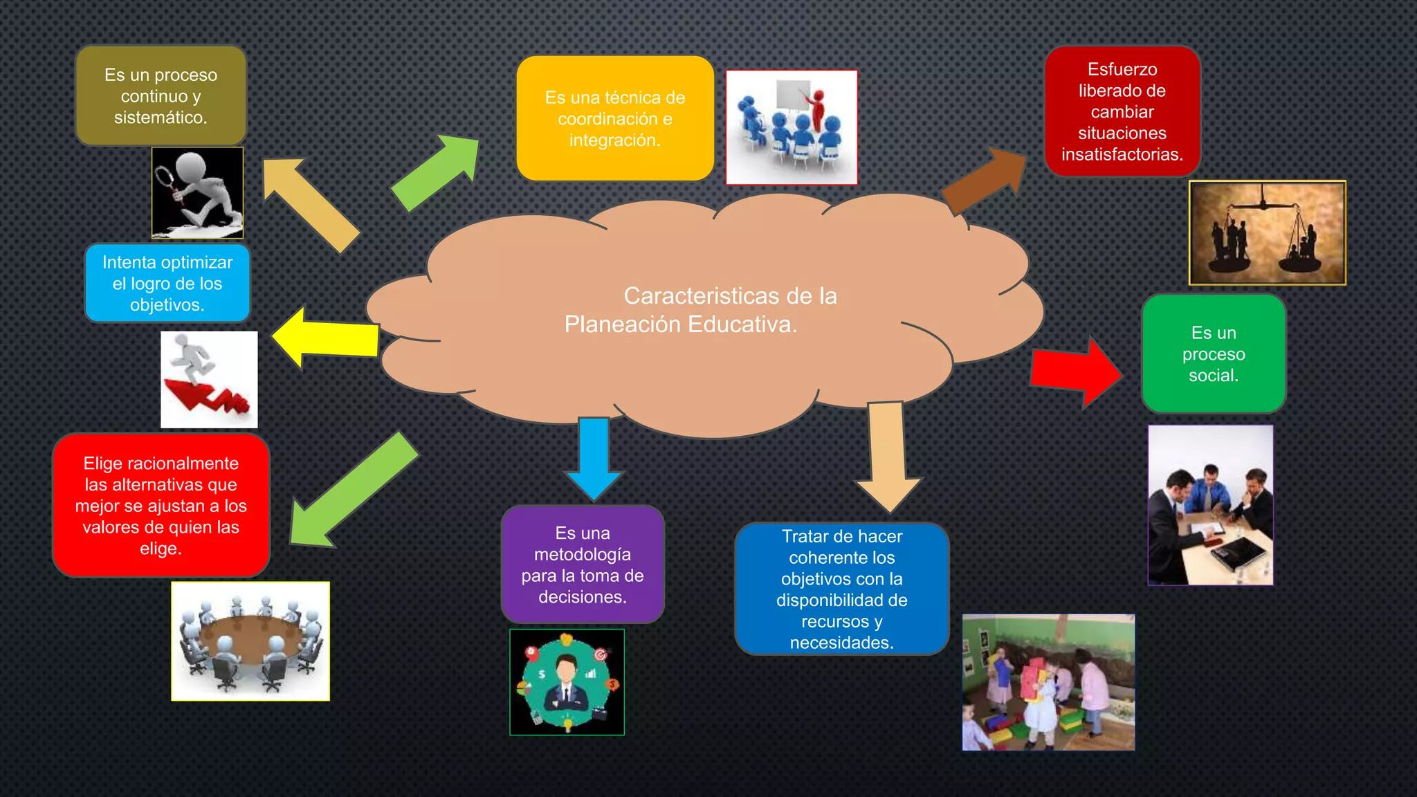 La planeación educativa es un proceso continuo, sistemático y social que intenta optimizar el logro de objetivos educativos eligiendo alternativas racionales que se ajustan a los valores y recursos disponibles, y sirve como metodología para tomar decisiones coherentes y coordinar e integrar esfuerzos para cambiar situaciones insatisfactorias.