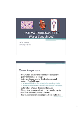 El documento describe el sistema cardiovascular, incluyendo la estructura y función de las arterias, venas y capilares. Explica que constituyen un sistema cerrado de conductos para transportar la sangre desde el corazón al cuerpo y de regreso. También describe la regulación del flujo sanguíneo por factores como el gasto cardiaco, la resistencia periférica y la regulación hormonal y nerviosa.