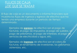 El documento explica qué es un flujo de caja y un flujo de caja proyectado. Un flujo de caja muestra los ingresos y egresos de efectivo de una empresa durante un período, mientras que un flujo de caja proyectado hace proyecciones sobre ingresos y egresos futuros. Ambos son útiles para la toma de decisiones financieras como determinar si se necesita financiamiento o si hay efectivo disponible para inversiones. El documento incluye un ejemplo detallado de cómo elaborar un flujo de caja proyectado mensual para una