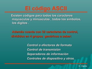 El documento describe el código ASCII (American Standard Code for Information Interchange), el cual es un estándar de 7 bits que permite 128 combinaciones para representar letras, números, símbolos y caracteres de control. El código ASCII incluye mayúsculas, minúsculas, números, símbolos y 32 caracteres de control divididos en 4 grupos como efectores de formato, control de transmisión, separadores de información y controles de dispositivo.