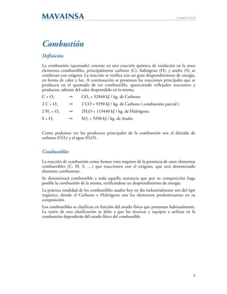 La combustión consiste en una reacción química de oxidación donde elementos combustibles como el carbono, hidrógeno y azufre se combinan con oxígeno, liberando grandes cantidades de energía en forma de calor y luz. Los productos principales de la combustión son el dióxido de carbono y el agua. La combustión requiere combustibles como madera, carbón, petróleo o gas natural, y oxígeno, el cual normalmente se suministra a través del aire. El proceso de combustión depende de factores como la preparación del