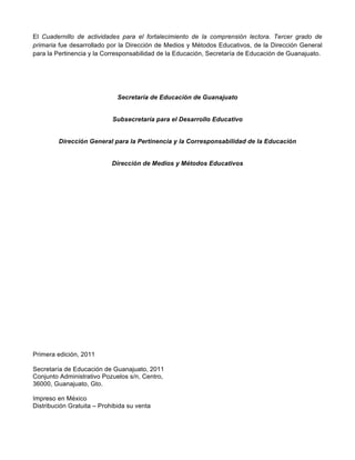 El documento presenta un cuadernillo de actividades para fortalecer la comprensión lectora en tercer grado de primaria. Fue desarrollado por la Secretaría de Educación de Guanajuato para apoyar la enseñanza de español y preparar a los estudiantes para evaluaciones. Incluye varios textos y actividades para trabajar habilidades de lectura.