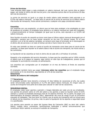 Este documento define conceptos clave relacionados con las contribuciones parafiscales y la seguridad social en Colombia. Explica que las contribuciones parafiscales son impuestos destinados a financiar actividades específicas que benefician directamente a los contribuyentes. También describe los componentes principales del sistema de seguridad social colombiano establecido por la Ley 100 de 1993, incluyendo el sistema de pensiones, salud, riesgos laborales y servicios sociales complementarios. Además, detalla las prestaciones sociales a las que tienen derecho los trabajadores y las