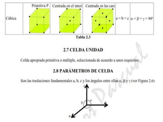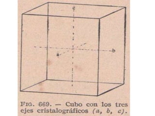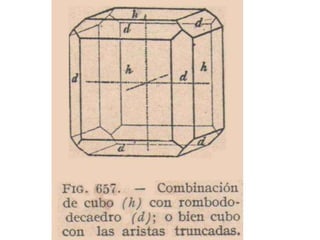 El documento habla sobre la cristalografía. Explica la fórmula de Euler para poliedros convexos, que establece que el número de caras más el número de vértices es igual al número de aristas más dos. También describe los sistemas cristalinos, las redes de Bravais y las leyes fundamentales de la cristalografía como la ley de constancia de ángulos y la ley de racionalidad de índices.