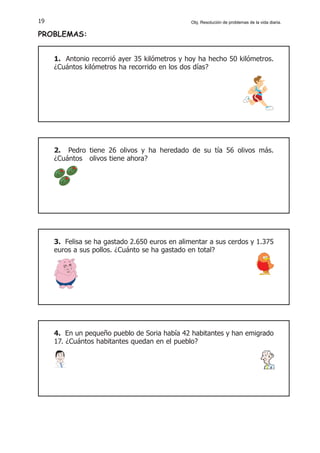 Este documento presenta una serie de problemas matemáticos de la vida cotidiana para que los estudiantes los resuelvan. Los problemas incluyen cálculos sobre distancias, herencias, gastos, poblaciones, edades y precios. El objetivo es que los estudiantes practiquen la resolución de problemas matemáticos relevantes para la vida diaria.