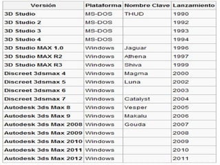 Autodesk 3ds Max es un software de diseño 3D y animación que permite modelar, iluminar y renderizar escenas en 3D de alta calidad. Ofrece herramientas para modelar superficies y objetos con curvas NURBS, asignar texturas mediante UV unwrapping, instanciar luces en proyectos arquitectónicos, y animar personajes usando sistemas de huesos y piel. El renderizado simula de manera realista efectos de iluminación como reflejos y refracciones usando ray tracing.
