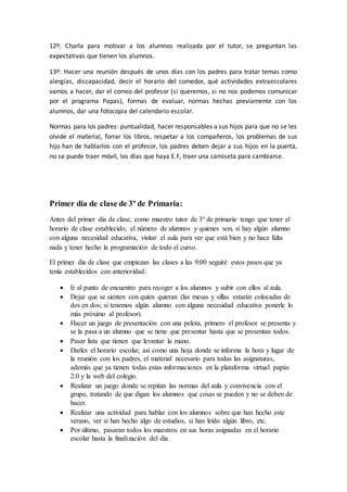 El documento describe los pasos que un maestro tutor debe seguir el primer día de clase de 3o de primaria. Antes del primer día, el maestro debe tener establecido el horario, conocer a los alumnos y sus necesidades, y preparar la programación del curso. El primer día, el maestro recogerá a los alumnos, los llevará al aula, los presentará, pasará lista, compartirá el horario y normas, y realizará actividades para conocerse. También debe preparar una reunión informativa con los padres para tr