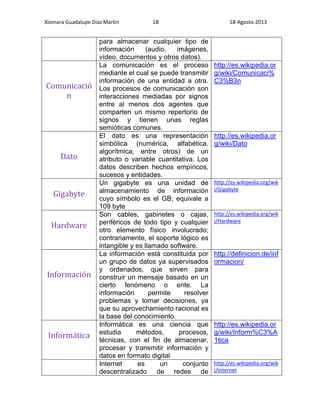 El documento define varios términos relacionados con las tecnologías de la información como aplicación, archivo, bit, byte, CD, comunicación, dato, gigabyte, hardware, información, informática, internet, kilobyte, megabyte, memoria, microprocesador, multimedia, operativo, ordenador, PC, periférico, red, ROM, software, sistema, tecnología, TIC's, virus y provee enlaces a Wikipedia para más información sobre cada término.