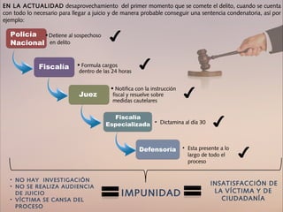 El documento describe los problemas con los delitos flagrantes en la actualidad, incluyendo que no hay investigación, no se realiza una audiencia de juicio, y la víctima se cansa del proceso, lo que resulta en impunidad e insatisfacción de la víctima y los ciudadanos. También propone un proceso mejorado para los delitos flagrantes que aprovecharía el primer momento en que se comete el delito para detener al sospechoso, formular cargos dentro de las 24 horas, y notificar e instruir al fiscal y juez sobre medidas