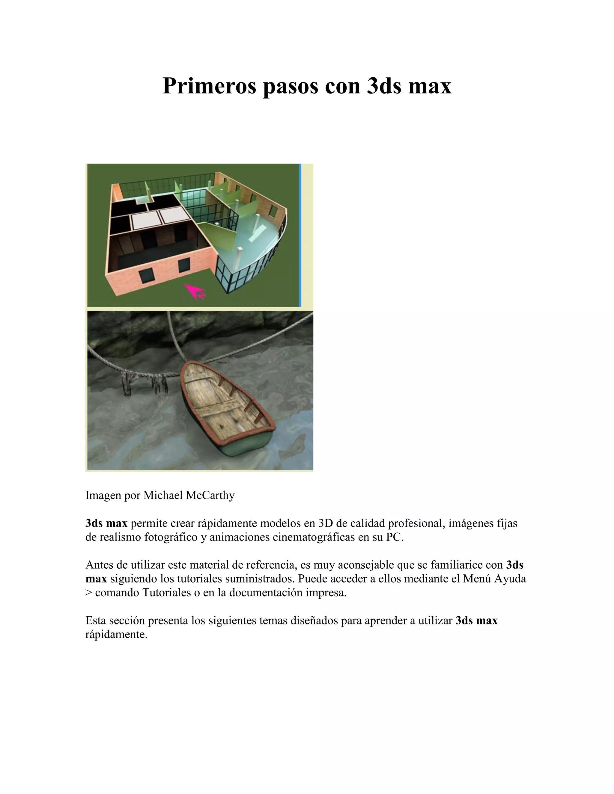 El documento proporciona una introducción a 3ds max, incluyendo cómo crear modelos 3D, aplicar materiales y luces, agregar cámaras, y animar escenas. Explica los conceptos básicos como crear y modificar objetos, diseñar materiales, incluir iluminación y cámaras, y animar transformaciones y parámetros. También brinda información sobre preparar la escena, como definir unidades y formatos de visor.