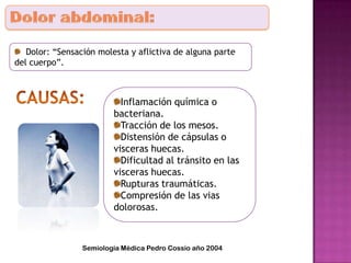 1) El documento describe diferentes tipos de dolor abdominal, incluyendo su localización, características e intensidad. 2) Explica dolores como el cólico biliar, apendicitis, diverticulitis, cistitis y dismenorrea. 3) También proporciona información sobre la semiología del dolor abdominal y signos clínicos para diferentes padecimientos.