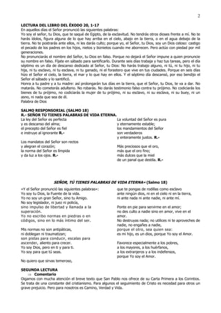 El documento presenta un sermón para la tercera semana de Cuaresma. Se habla de seguir el camino de conversión y de expulsar los mercaderes del templo para echar de nuestros corazones el materialismo. También se presentan lecturas bíblicas sobre los Diez Mandamientos, la crucifixión de Cristo y Jesús expulsando a los mercaderes del templo para purificar la religión.