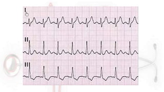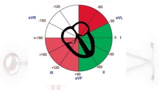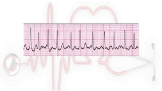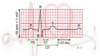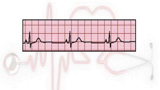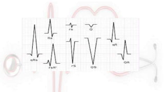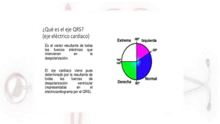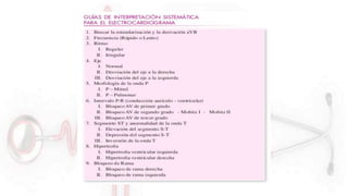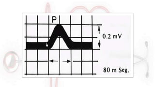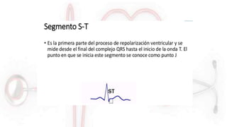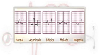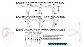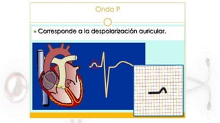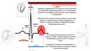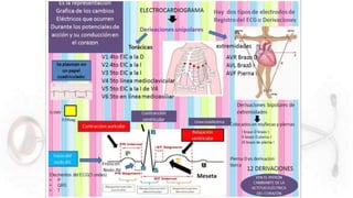 El documento proporciona información sobre el electrocardiograma (ECG). Explica que el ECG registra las variaciones del potencial eléctrico generado por las células cardiacas a través del tiempo. Las variaciones en el potencial eléctrico durante el ciclo cardíaco producen las ondas características del ECG. También describe cómo se colocan los electrodos para obtener las diferentes derivaciones y trazar el ECG.