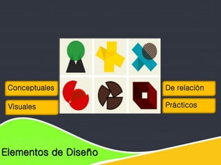 Los elementos de diseño se dividen en cuatro categorías: elementos conceptuales (punto, línea, plano, volumen), elementos visuales (forma, medida, color, textura), elementos de relación (dirección, posición, espacio, gravedad) y elementos prácticos (representación, significado, función). Juntos, estos elementos permiten la creación de diseños visuales mediante la manipulación de formas, espacios y relaciones.