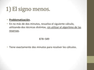 El documento aborda la enseñanza del signo menos en matemáticas, destacando su complejidad y las dificultades que enfrentan los alumnos en diferentes niveles educativos. Se exploran varios ejemplos y técnicas para enseñar la sustracción y la interpretación del signo menos como operación, signo y operador, enfatizando la necesidad de un enfoque gradual en el currículo escolar. Además, se discuten conceptos de proporcionalidad y linealidad, y se advierte sobre errores comunes en la enseñanza de estas temáticas.