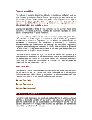 El documento trata sobre el proyecto geométrico de carreteras. Explica conceptos como alineamiento horizontal, tangentes, curvas circulares, distancias de visibilidad como la de parada, rebase y encuentro que son importantes para proyectar carreteras de manera segura considerando la velocidad y características del tránsito. También describe tres tipos de terreno y cómo estos afectan el alineamiento de caminos.