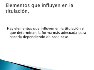 Este documento discute los diferentes tipos de titulación en medios de comunicación y las consideraciones para titular artículos. Explica que la titulación depende del medio (periódicos, revistas, etc.), la sección (duras o blandas) y el espacio disponible. También proporciona reglas generales para titular de acuerdo al tamaño del artículo y principios como ser conciso, preciso, reflejar el contenido y atraer al lector.