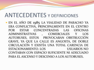 El documento analiza la problemática vial en Paracho, destacando la congestión en el centro debido a la concentración de autobuses y oficinas, lo que llevó a un cambio de ubicación en 2002. Aún así, persisten problemas de obstrucción y servicios insuficientes debido al aumento de pasajeros. También se mencionan aspectos históricos, demográficos y culturales de la localidad, así como la importancia de proyectos arquitectónicos para mejorar la situación.