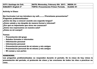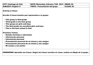 Este documento contiene tres resúmenes de clases de inglés de tercer grado en Santiago de Cali. La primera clase presentó el curso y enseñó sobre presentaciones, saludos formales e informales, y partes del cuerpo. La segunda clase se centró en presentar al grupo a través de frases. La tercera clase cubrió saludos formales e informales. Cada clase incluyó temas futuros y tareas relacionadas con el tema de la lección.