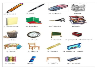 El resumen describe dos documentos sobre clases de inglés en Santiago de Cali. El primer documento presenta el programa para el segundo periodo y cubre temas como útiles escolares, plural de sustantivos, números y horas. El segundo documento se enfoca en dibujar y escribir en inglés los nombres de útiles escolares comunes. También incluye frases útiles para usar en el salón de clases.