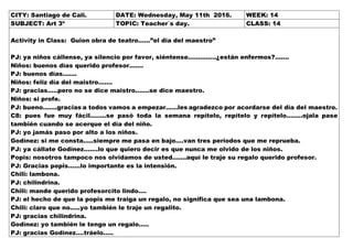Este documento contiene resúmenes de 4 clases de inglés y arte de varias semanas. La primera clase cubrió los pronombres this, these, that y those. La segunda clase fue sobre el Día del Maestro e incluyó una obra de teatro. La tercera clase repasó los pronombres. La cuarta clase fue una prueba de inglés tipo ICFES. La quinta clase cubrió los números del 1 al 20 y la hora.