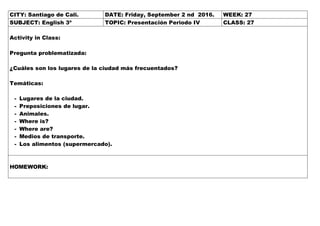 Estos documentos resumen las actividades de clase de inglés y arte para estudiantes de tercer grado en Santiago de Cali. En inglés, las lecciones se centraron en lugares de la ciudad, preposiciones de lugar y animales. En arte, las lecciones incluyeron fono mímica, teatro y exposiciones artísticas. Las tareas incluyeron dibujos de lugares de la ciudad y continuar preparando fono mímicas.