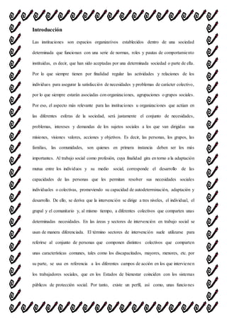 Este documento describe el ámbito profesional institucional del trabajo social. Explica que el trabajo social institucional se encarga de organizar y concretar los servicios y apoyos brindados por las instituciones para satisfacer las necesidades de los sujetos sociales. También describe las diferentes áreas de intervención del trabajo social como la salud, educación, bienestar social, y los sistemas de servicios sociales.