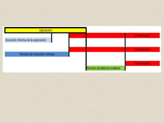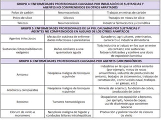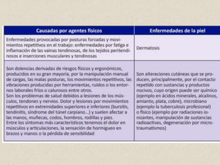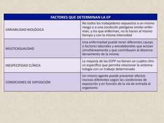 Este documento describe las enfermedades profesionales y ocupacionales, incluyendo sus criterios de diagnóstico. Define las enfermedades profesionales como aquellas producidas por la exposición a agentes en el trabajo, y discute los criterios clínicos, ocupacionales, higiénicos-epidemiológicos y de laboratorio para la valoración de estas enfermedades. También enumera varios agentes químicos, físicos y biológicos y las enfermedades que pueden causar una exposición laboral a