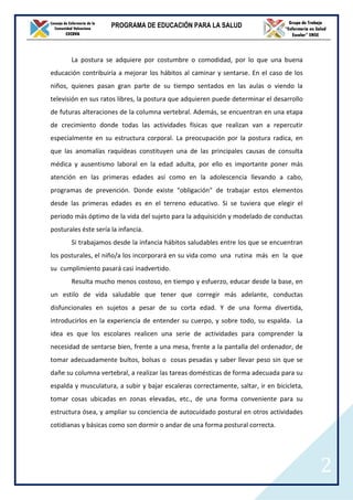 El documento presenta un programa de educación para la salud sobre ergonomía dirigido a estudiantes de diferentes edades. El programa busca enseñar posturas correctas a través de sesiones que incluyen canciones, demostraciones y discusiones sobre cómo cuidar la columna vertebral al sentarse, caminar, levantar objetos y realizar otras actividades diarias. El objetivo final es prevenir dolores de espalda promoviendo hábitos posturales saludables desde una edad temprana.