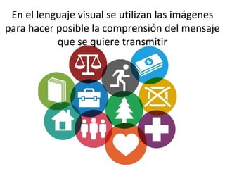 Este documento trata sobre la comunicación visual. Explica que la comunicación visual implica la elaboración, difusión y recepción de mensajes a través de imágenes. Describe los conceptos de significante, significado y código visual. Identifica los elementos clave de la comunicación visual como el emisor, mensaje, receptor y medio. Además, distingue entre diferentes tipos de lenguaje visual como el objetivo, publicitario y artístico.